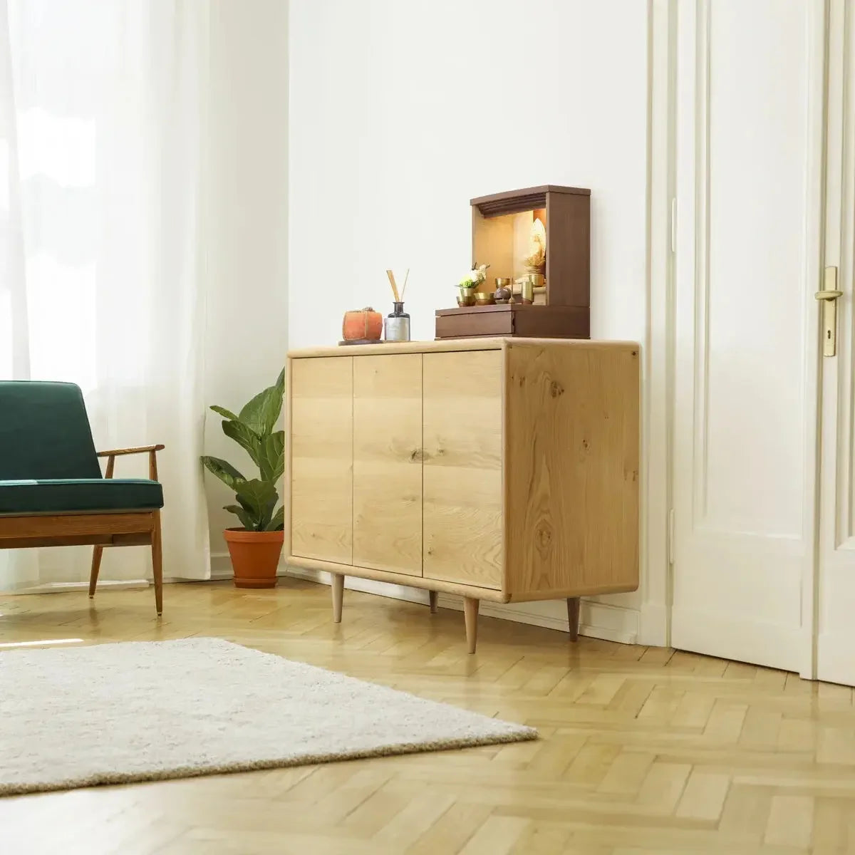 近年、お客様の購入内容をみると当店では「家具(サイドボード・チェスト)」の販売が非常に多くなっており、現在では仏壇台よりも出荷台数は多くなっております。お仏壇を家具と合わせて頂くことでお仏壇周りの雰囲気も一段とおしゃれにコーディネートして頂けます。一方、仏壇台の方は「仏具を置くスライド板」が設置されているものが多いのと、仏壇と同じメーカーが色を合わせて製作しているシリーズも一部あります。