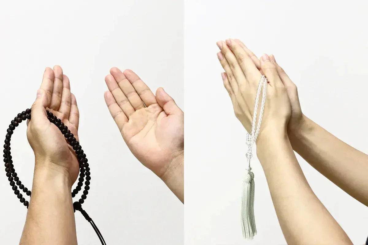 珠数を両手の中指にかけ、そのまま手を合わせて合掌します。真言宗は念珠を擦り鳴らして音をたてます。珠数を擦ることは百八煩悩をすり砕き、百八菩提の正常な光明を磨きだすことだと、「金剛頂瑜伽念珠軽」に説かれています。