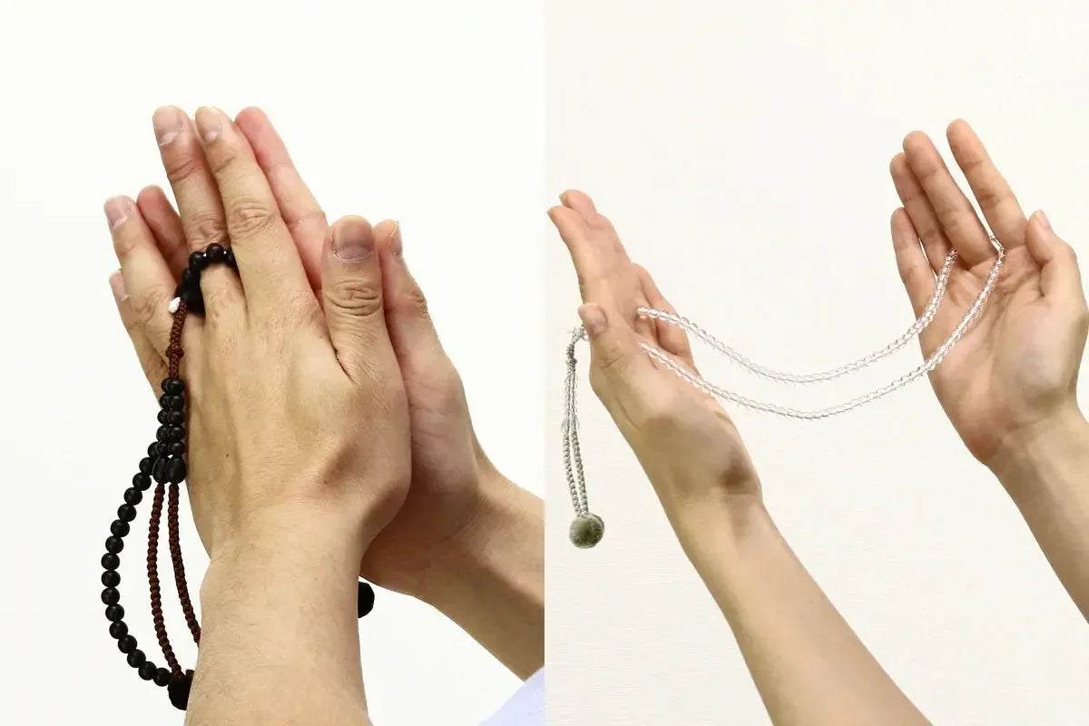 念珠は大きく分けて2種類の形式があります。全宗派共通で使える略式念珠(片手念珠)、宗派によって形の異なる本式念珠(正式念珠)があります。