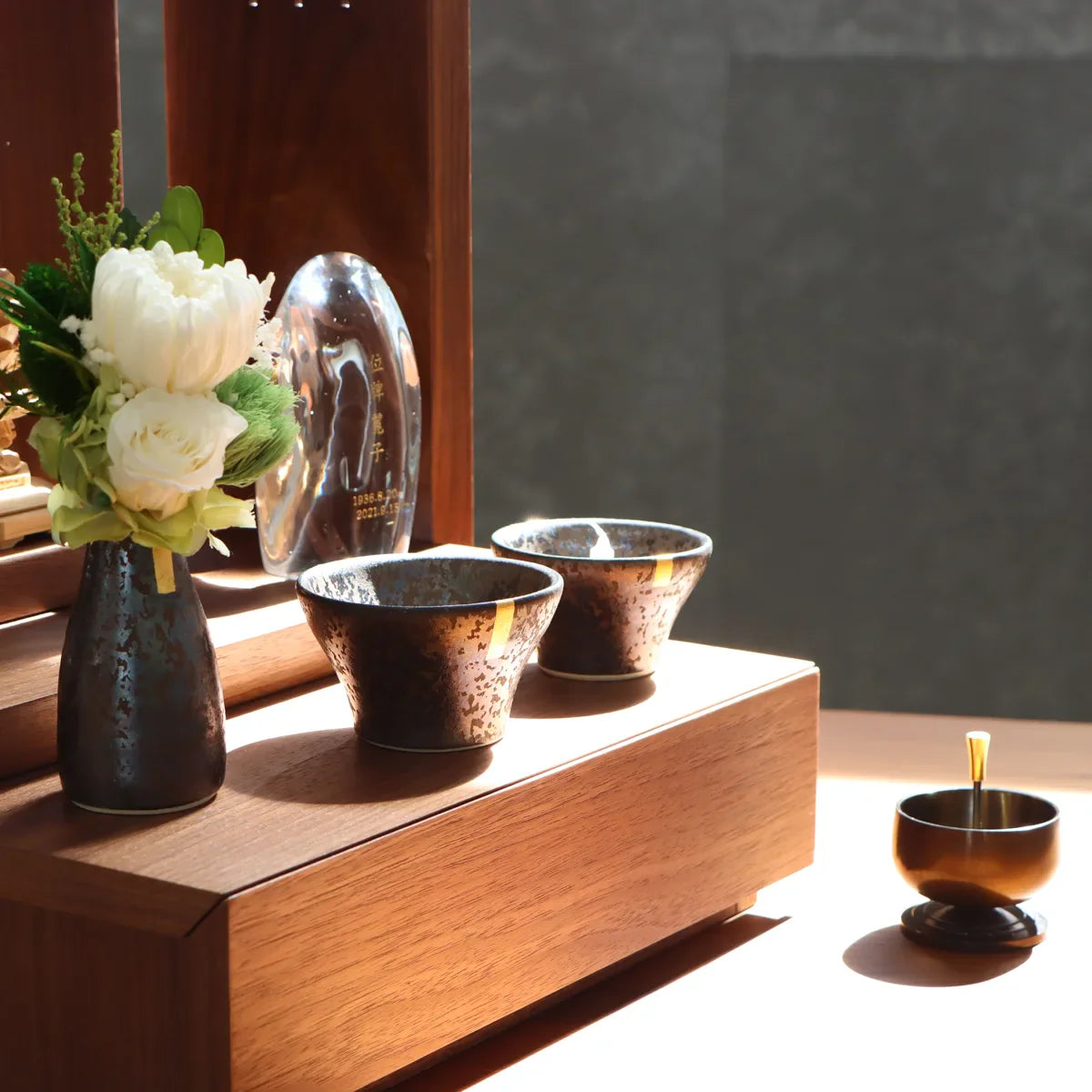 おしゃれなミニ仏壇に飾った陶器の仏具セット