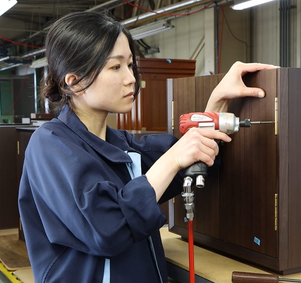 仏壇の「構造上の修理」で特に発生しやすいのは扉の部分です。国内のすべての仏壇で共通の特徴ですが、扉は機械で取り付けられず、職人が1つずつ手作業で取り付けます。さらに、重い扉のある仏壇は時間の経過とともに扉が少し垂れることがあるため、経年変化を見越した製作技術が重要です。