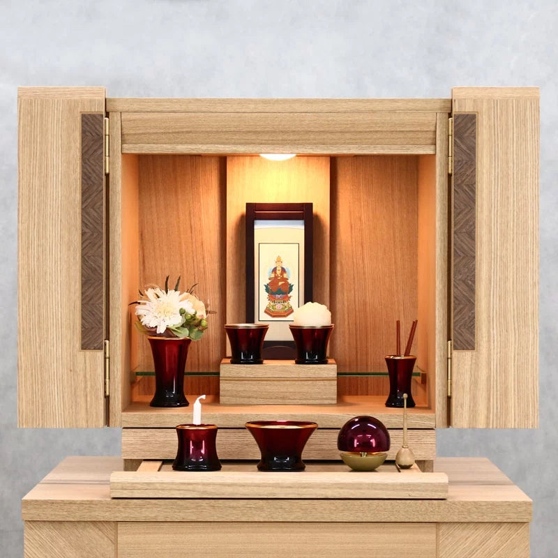 仏具によって荘厳(しょうごん)して初めてお仏壇としての意味を持ちます。仏具はご本尊を供養するのと共に、ご先祖様や亡き人を供養するためのものです。