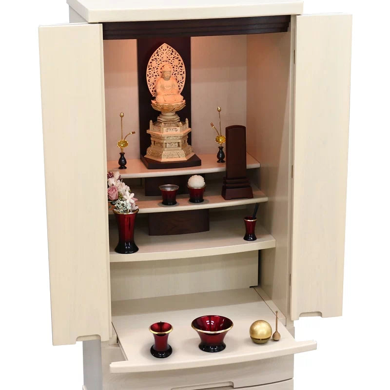 現代の仏壇に合わせて作られたコンパクトでスマートな仏具です。スタイリッシュなフォルムは、さまざまなお仏壇やお位牌などとも調和します。お仏壇を艶やかな表面は美しく輝き、色合いは、上品な祈りの場を創り出します。各仏具の開口部の縁取りはゴールドで高級感と存在感を高めます。