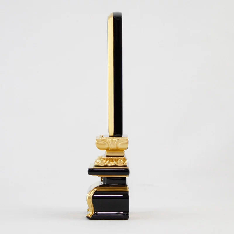 お位牌では最高級の仕上げ方法の呂色(ろいろ)仕上げを施し、鏡のような鏡面の美しい仕上がり。極小のチリ一つの付着も許さない環境下で位牌職人の手作業で丁寧に塗りと磨きを繰り返していきます。最上の本漆と本金の加飾部分は金沢の最高純度の金粉(五毛色金粉)を100%使用した逸品です。