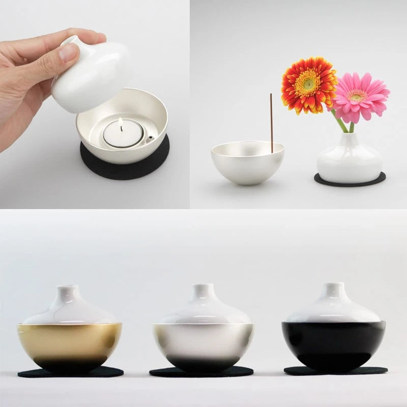 日常は花瓶として故人へ季節のお花を飾り、特別な時には陶器製の花器を金属製の器と分けて、香炉+火立の機能を持つ、お線香とロウソクに火を灯します。ローソクの火を消す際は陶器の花立を上にかぶせれば安全に消火することができます。