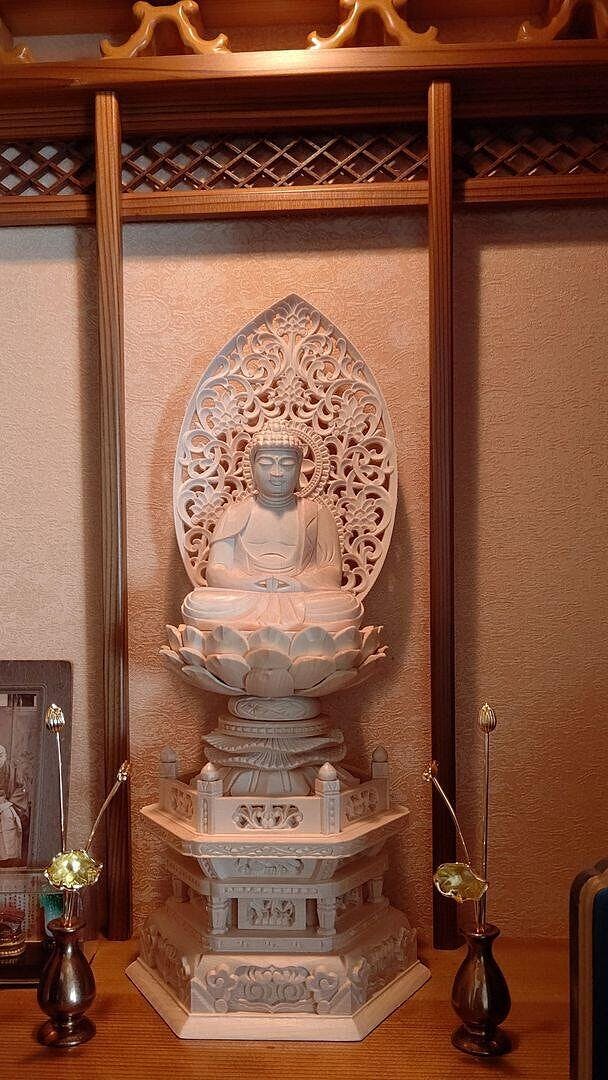 忌明け法要に間に合うようにお届け出来安心致しました。木像タイプのご本尊様を飾られるとより功徳があると云われていますのでお仏壇に見合った阿弥陀様をご用意され立派なしつらえになり良かったです。ご家族の皆様を見守ってくださる事と存じます。数ある仏壇店の中から当店をお選び頂き有難うございました。