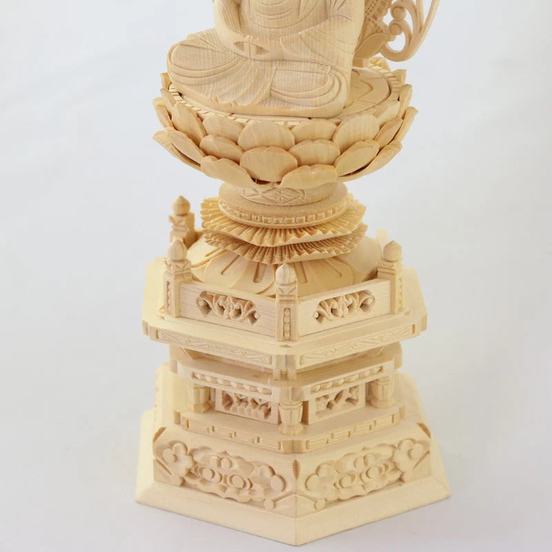 仏像の台座は六角台座という台座で彫りが細かくずっしりとした重量感が特徴。また六角台座は背の高い台座になりますので大型仏壇にオススメの台座です。
