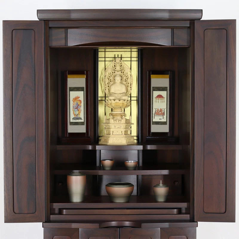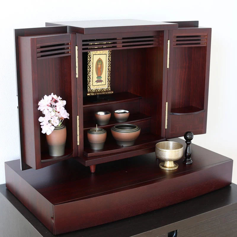 夕暮れの色合いをイメージして作られた、和の雰囲気を感じる高級仏具。マットな質感や風合いを焼付塗装で実現した仏具シリーズです。どこか愛着が湧いてくるような趣きのある色合いと質感。光を当てると絹のような柔らかな煌きを楽しめます。