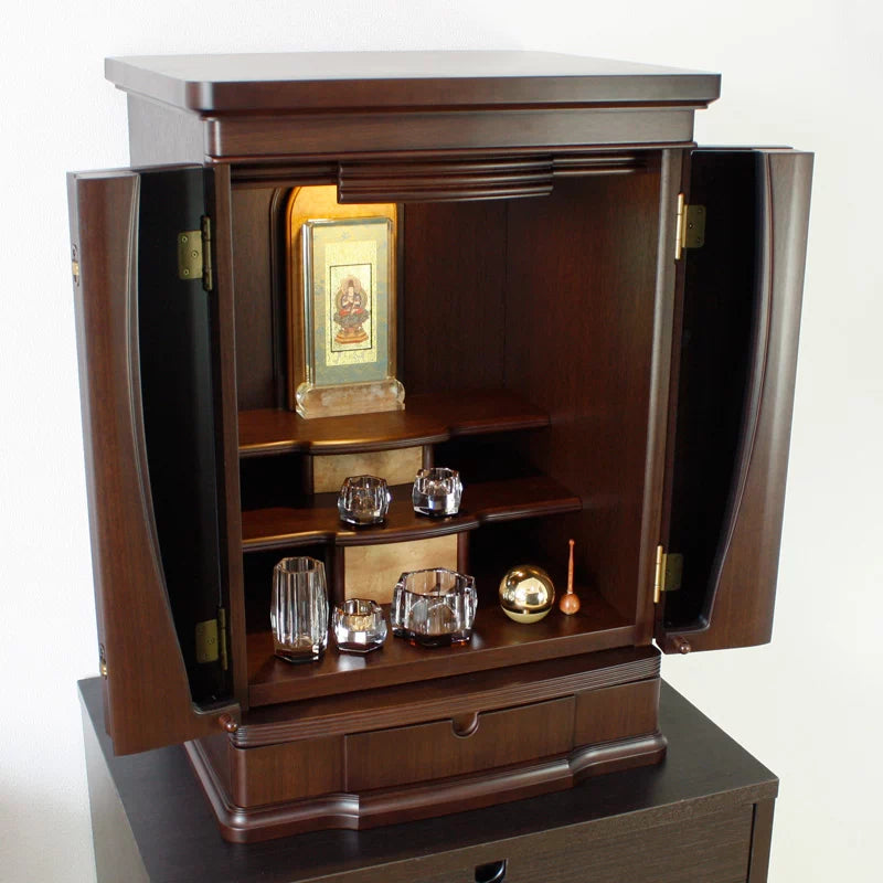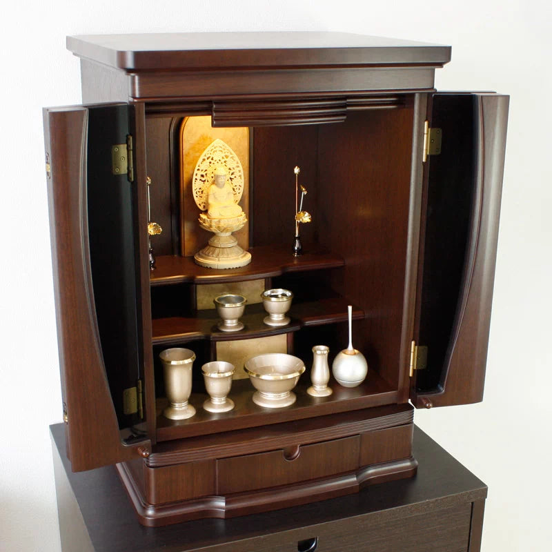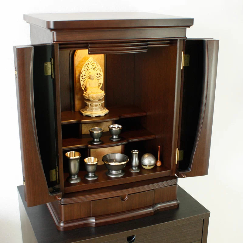 • 特 徴: 国産品 、 LEDライト 、 仏具板 、 引き出し収納 、 形見入れ 、 柾目の直線が多めの木目 、 セット仏壇の仏具シュミレーションあり 、 台の上に設置するタイプ