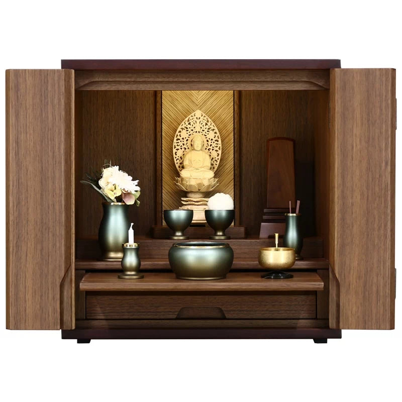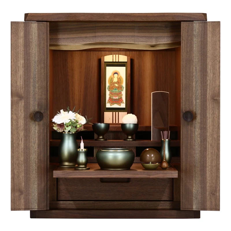 曲線のフォルムがお仏壇に飾った際に優しい雰囲気を作りだします。色合いはマット色の深い緑色と茶色のグラデーション。趣きがあるカラーはモダン仏壇はもちろんのこと和風のお仏壇にもよくマッチします。各仏具の開口部の縁取りが高級感と存在感を高めます。