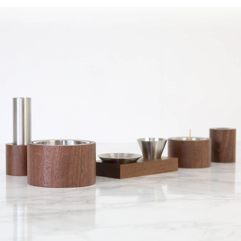 ステンレスと高級木材ウォールナットの仏具セット。ウォールナットの木のぬくもりと、高純度のステンレスの輝きがオシャレな祈りの空間を演出します。