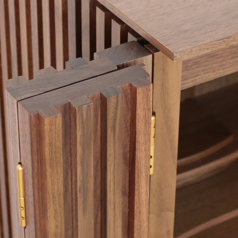 • 扉や格子部分はウォールナットの無垢材で作られています。また扉の蝶番部分(金具)はストレートヒンジを使用し、内側・外側どちらからも目立たない作りとなっております。