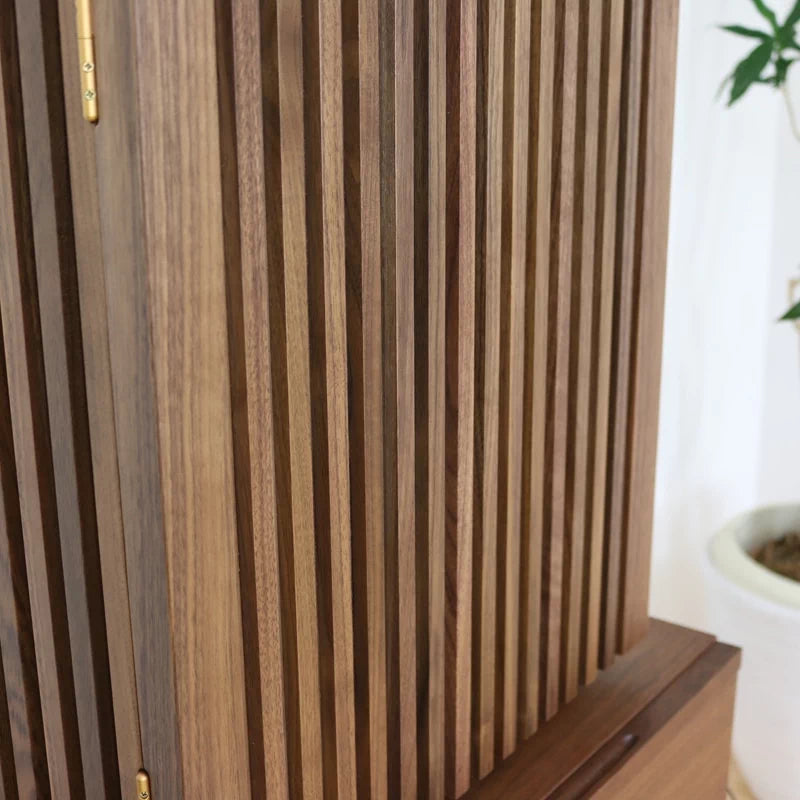 木材には最高ランクの評価を得ているアメリカンウォールナットを使用。高級家具や世界の高級車のウッドパネルなどに使われる高級木材です。格子の部分や扉はウォールナットの無垢材のみをふんだんに使用して作られています。