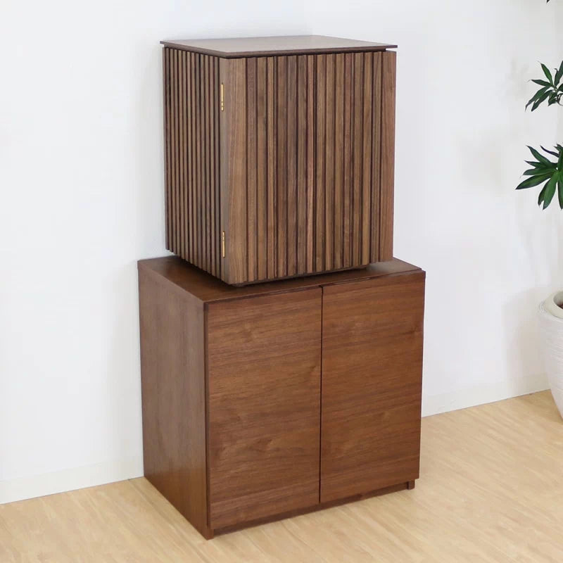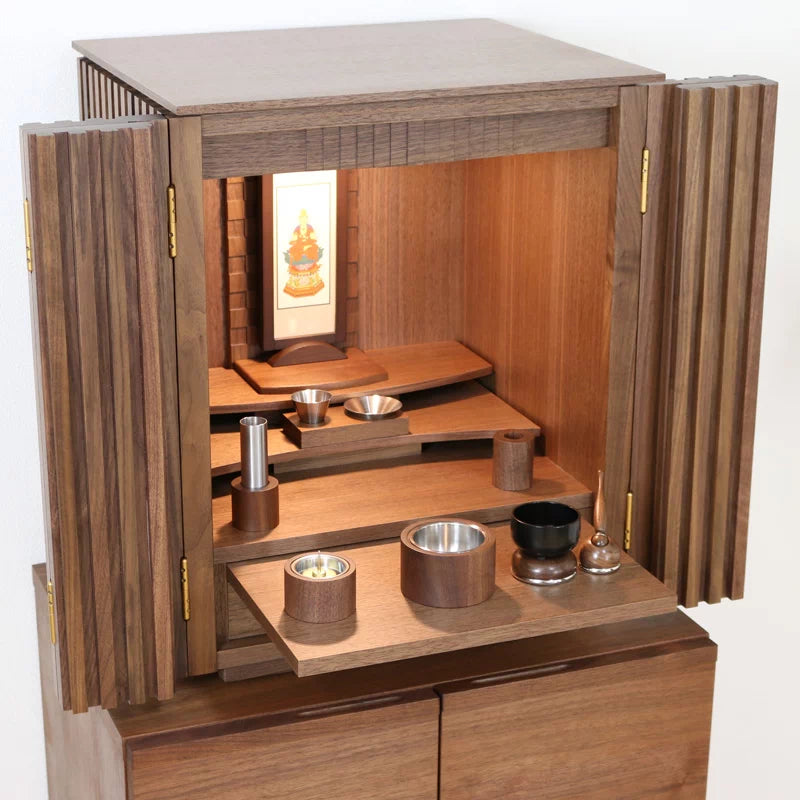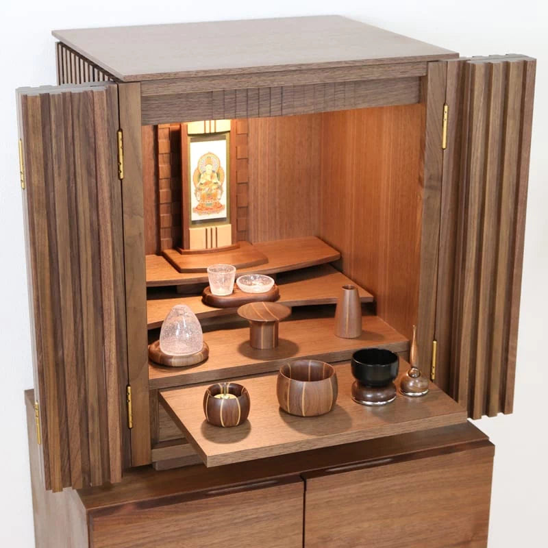 • 同じ木材の家具調仏壇台 ウォールナット オイル仕上げに設置した例。仏壇台にはお仏壇に関わるものやお盆飾り・納骨前の骨壺などを入れておくことが可能です。仏壇台は正座してお祀りするのに丁度良い高さに設計されております。