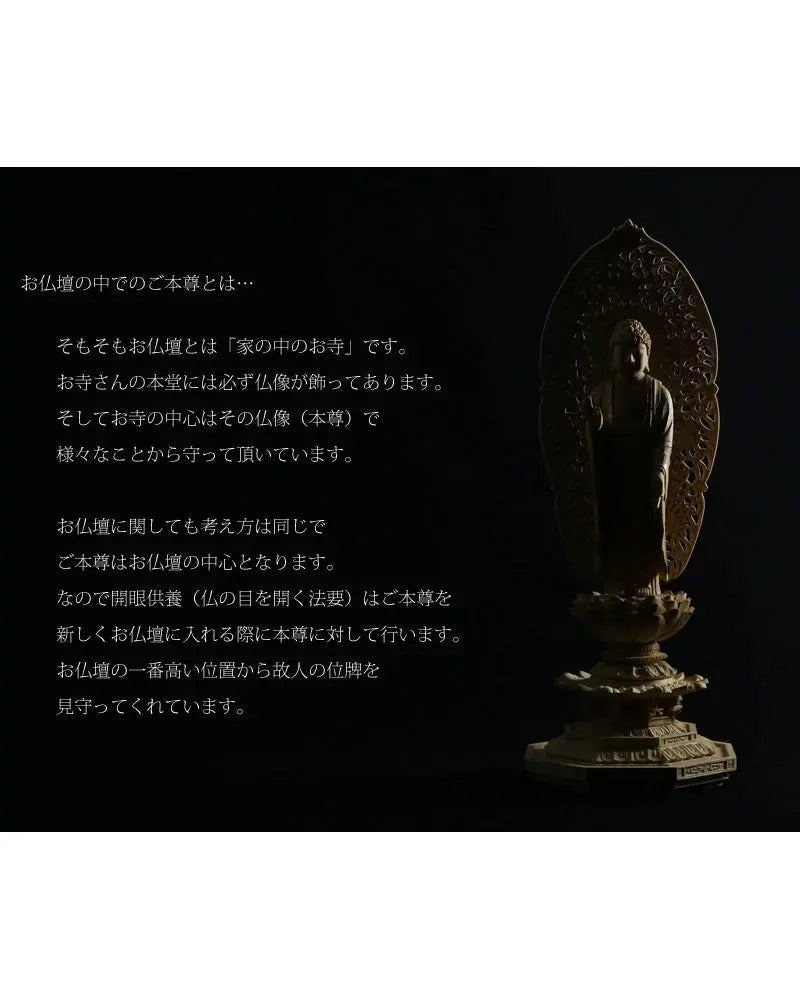 - 特 徴: ミニ~中型仏壇向き 、 玉眼入り(眼を埋め込む) 、 白毫・肉髻(額にガラス玉) 、 金泥書(仏身に金の筆書き) 、 切金(仏身に金を貼る) 、 選べる光背 、 浄土宗 、 融通念仏宗 、 時宗