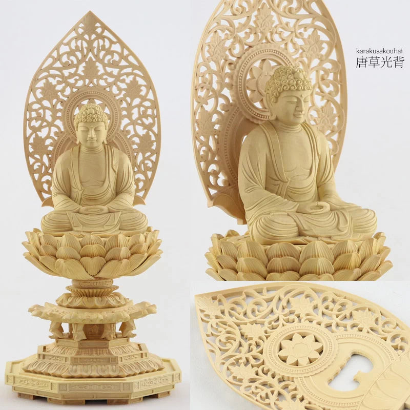 本柘植仏像 上彫り 八角台座 座釈迦 【曹洞宗・臨済宗・禅宗】:1.8寸 / 切金 / 唐草光背