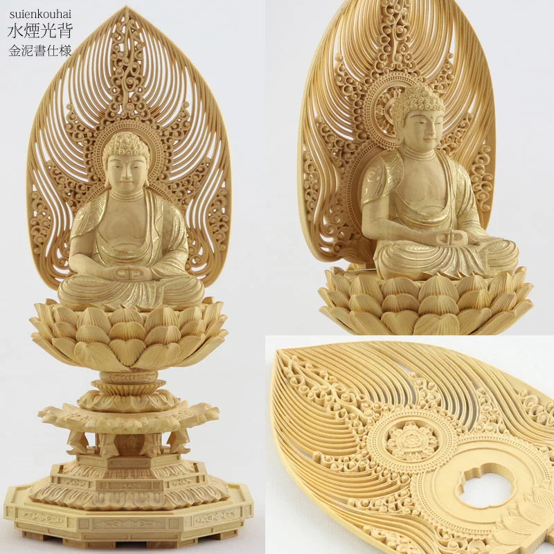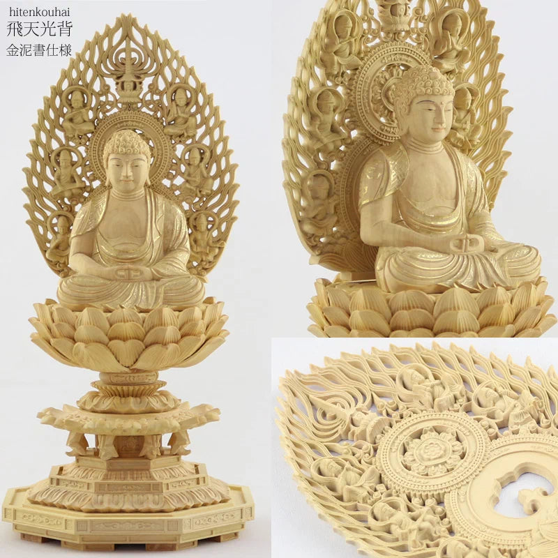 • 特 徴: ミニ~中型仏壇向き 、 玉眼入り(眼を埋め込む) 、 白毫・肉髻(額にガラス玉) 、 金泥書(仏身に金の筆書き) 、 切金(仏身に金を貼る) 、 選べる光背 、 天台宗