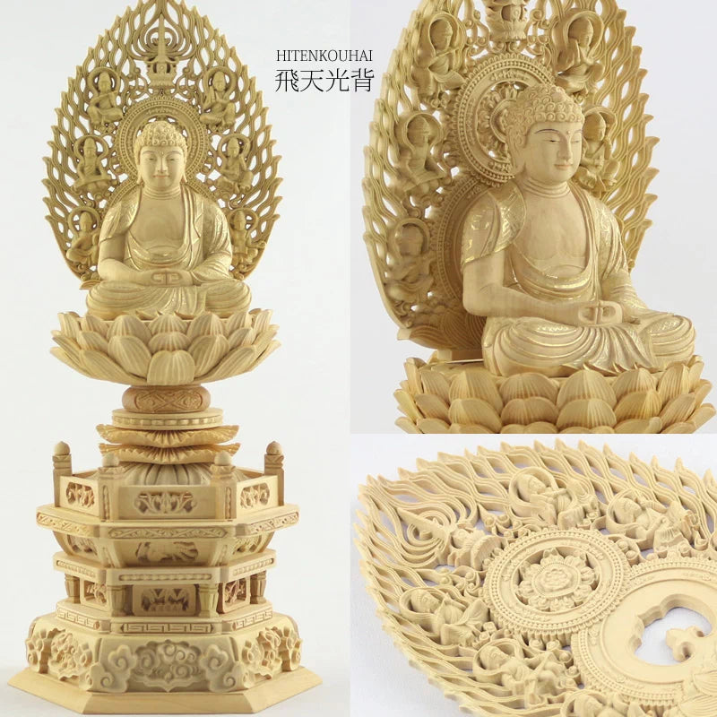 本柘植仏像 上彫り 六角台座 座阿弥陀 【天台宗】:2.0寸 / 切金 / 飛天光背