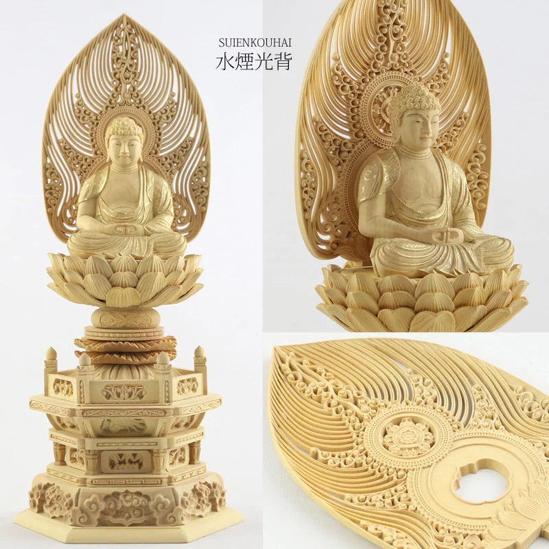 本柘植仏像 上彫り 六角台座 座阿弥陀 【天台宗】:1.8寸 / 切金/眼入り / 水煙光背