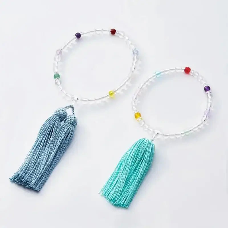 母と子でおそろいの念珠セットです。七色の石には厄除けの意味があります。