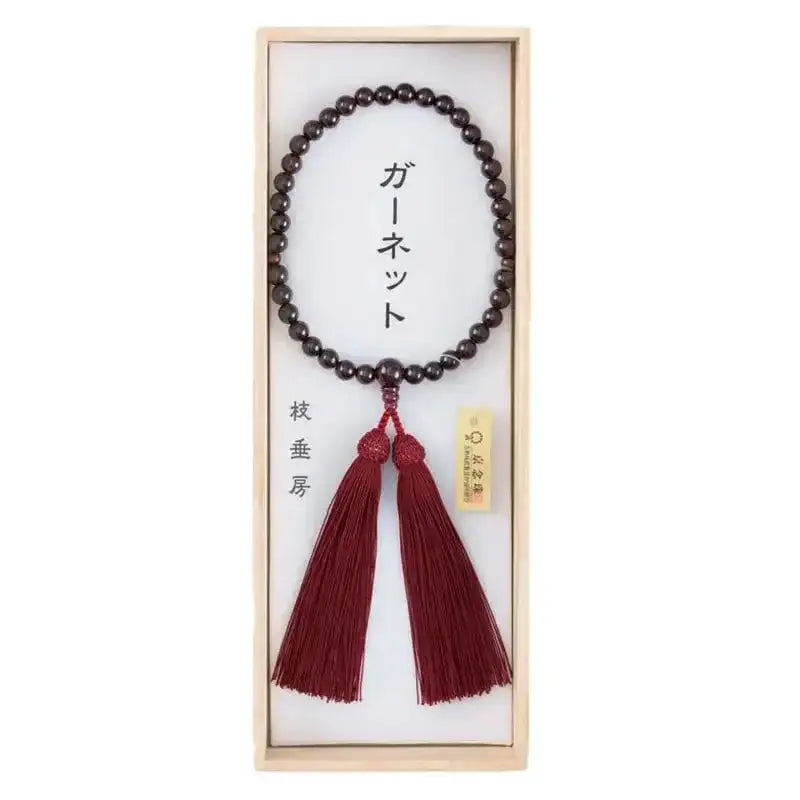 ガーネットを使用した高級京念珠。房はベーシックデザインの頭房です。