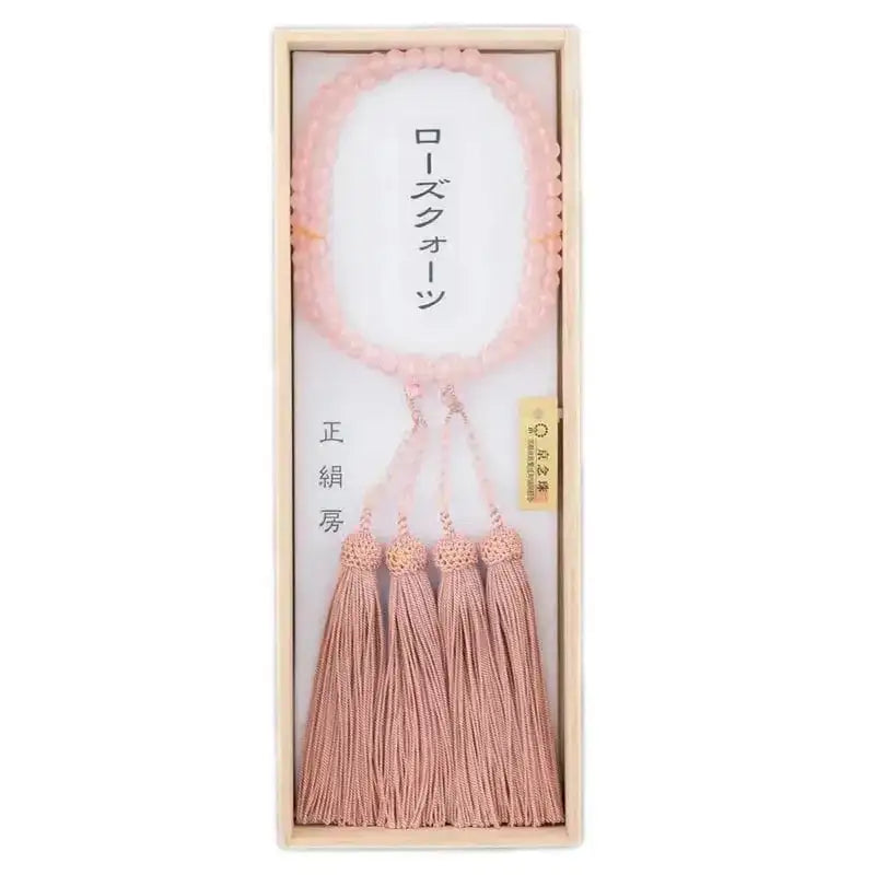 女性用の二連のお念珠(数珠)です。こちらは宗派を問わずどなたでもお使い頂ける二輪(2連)の略式二連念珠とよばれるお念珠です。一重のものに比べて豪華な作りとなっております。珠にはローズクォーツを使用しております。
