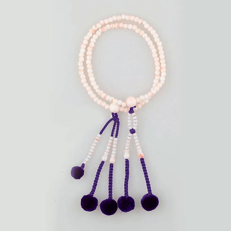 女性用は、108の主玉に四天玉が4つ入った輪に、「蓮如結び」と呼ばれる独特の結び方をした房が親玉からつながっています。
