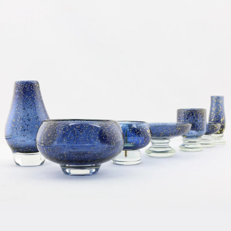 一つ一つガラス職人の手作りの高級ガラス仏具。美しい藍色の色ガラスに金箔を散りばめました。