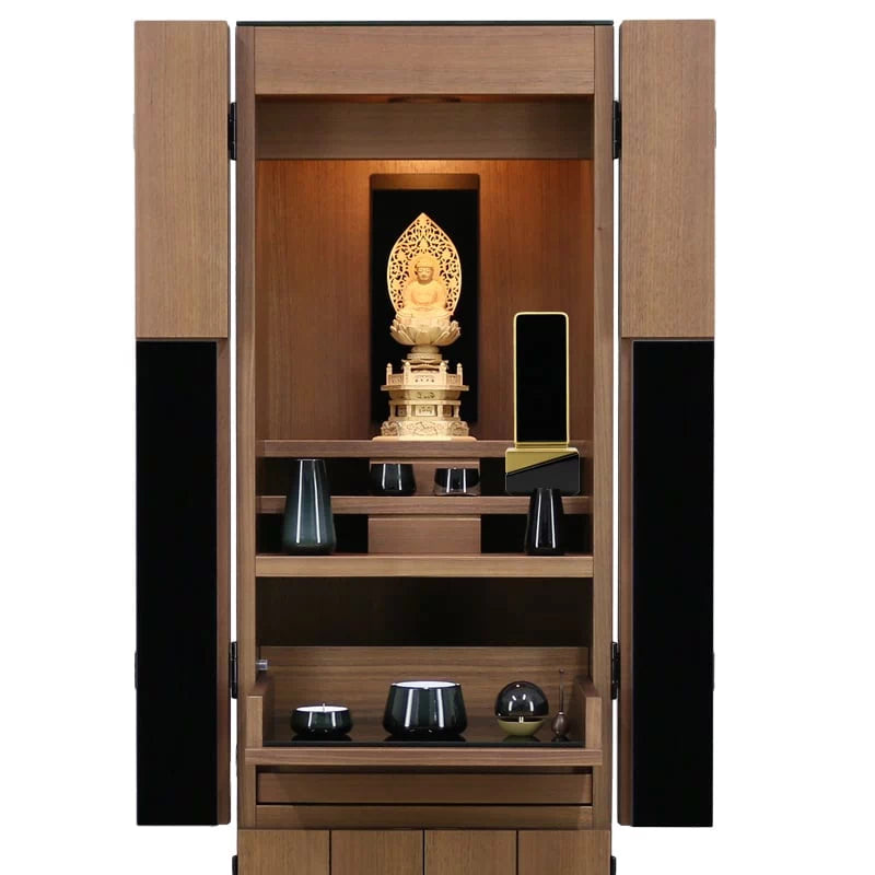 お仏壇に仏具一式を飾りつけたお飾り例です。モダン仏壇は仏具の飾り付けは必要最低限の仏具5~6点セットの「仏具セット」+「おりん」を飾るのが一般的です。