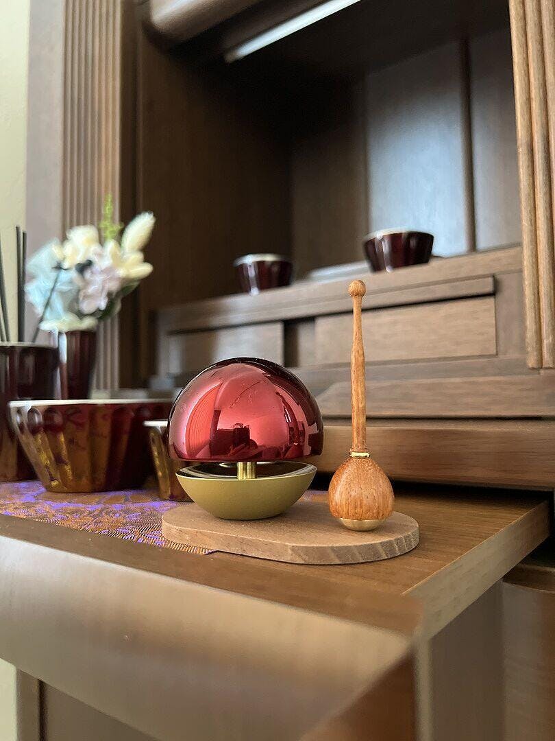 グッドデザイン賞にも輝いた丸いフォルムの可愛いおりん「たまゆらりん」のレッド色です!モダン仏壇・家具調仏壇はもちろん、従来の仏壇にもマッチする人気NO.1のおリンシリーズです。レッド色は強いレッドではなく、ワイン色に近いレッドなので落ち着いた雰囲気が漂います。ワイン色の仏具と組み合わせて飾ったり、アクセントでリンの色だけ変えたりするなどレッドは様々な色合わせが可能です。