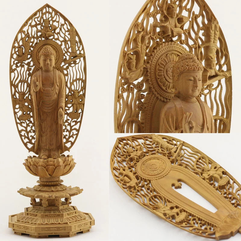 檀木仏像 八角台座 舟立弥陀 眼入り 飛天光背【浄土宗・時宗】:3.5寸 / 木地