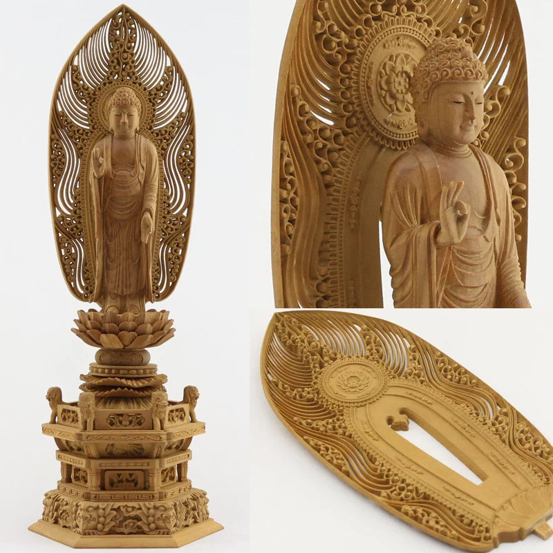 仏像は台座・光背・仏身(立像は手も外れます)が外れる様になっております。開眼供養などの際の持ち運びの際などはパーツを外して、購入時の箱に入れて持ち運ぶことをおすすめします。彫刻部分は落下などの衝撃などが加わると割れやかけてしまうことがあります。