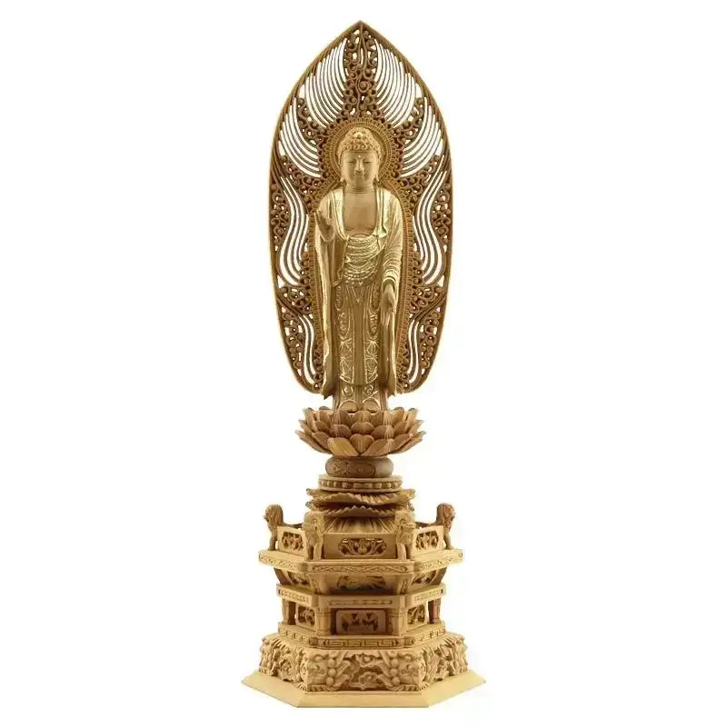 檀木仏像 六角鬼面麒麟台座 舟立弥陀 眼入り 水煙光背【浄土宗・時宗】:4.5寸 / 切金