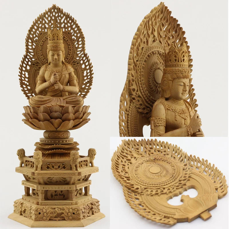 檀木仏像 六角鬼面麒麟台座 大日如来 眼入り 二重火炎光背 【真言宗】:3.0寸 / 木地(納期2~4ヵ月)