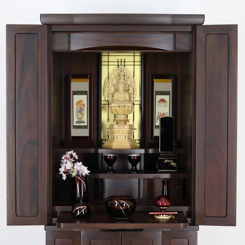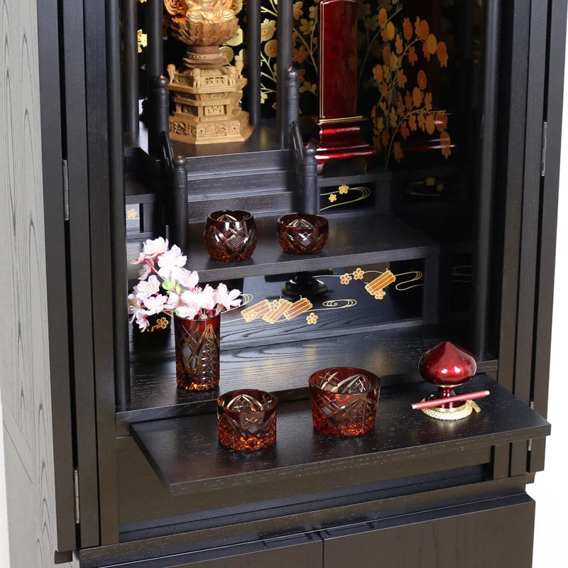赤光(しゃっこう)はワイン色の深い色合いです。金箔を使用した漆芸のような美しさがあります。仏壇にアクセントとして合わせることのできる色合いです。