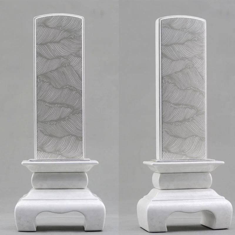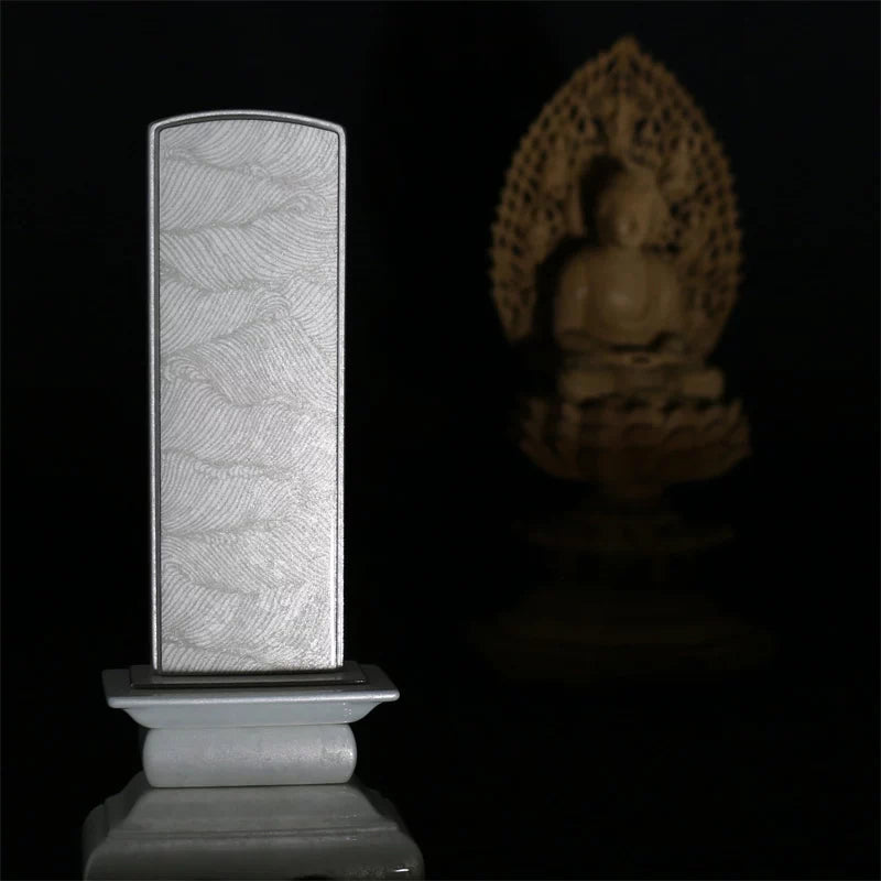 高貴な色合いの「さざれ波 白銀(しろがね)」。今までにない白いお位牌です。通常は「お位牌=黒」というイメージを持たれている方も多いですが、仏教においてお位牌やお仏壇の色に関しての教えはありません。