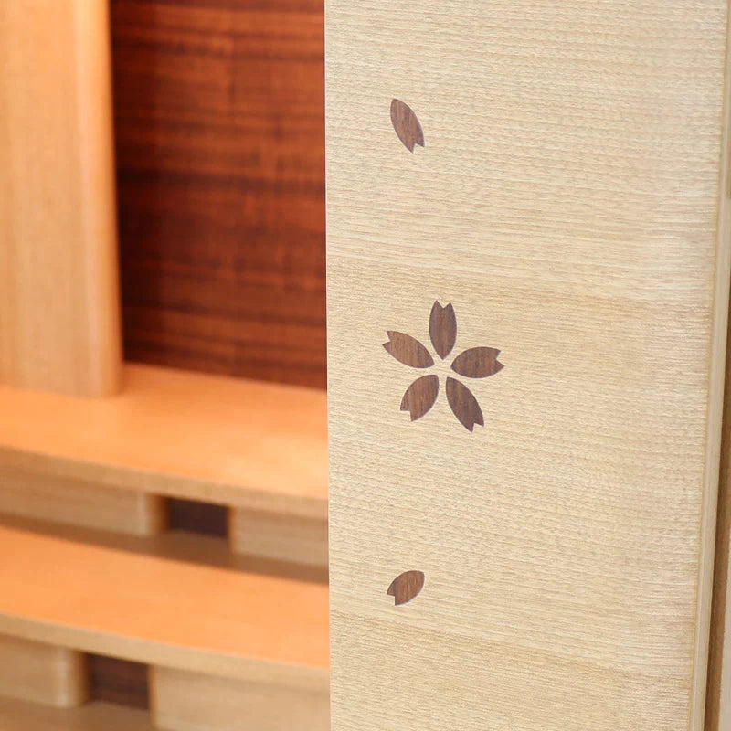 扉の可憐な桜の彫刻がおしゃれな国産モダン仏壇。日本の文化に深く根付いてきた桜はどこか ”ホッと”心落ち着く祈りの空間を創り出します。桜の彫刻は風になびく躍動感が感じられる配置でデザイナーのこだわりが映し出されております。和室にはもちろんのことシンプルな容姿は洋室に設置して頂いても違和感のないデザインのお仏壇です。