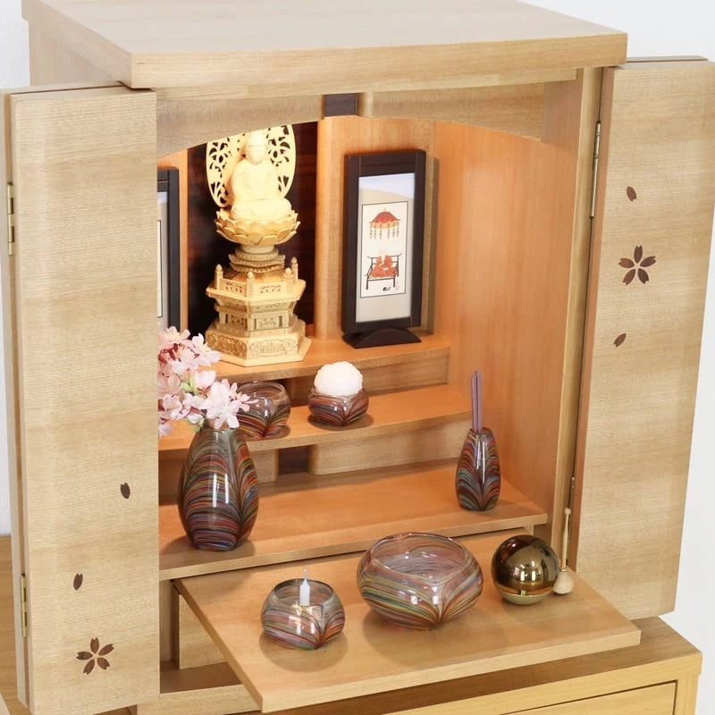 桜の彫刻がおしゃれなモダン仏壇。北海道産の樺桜材を使用した純国産仏壇。