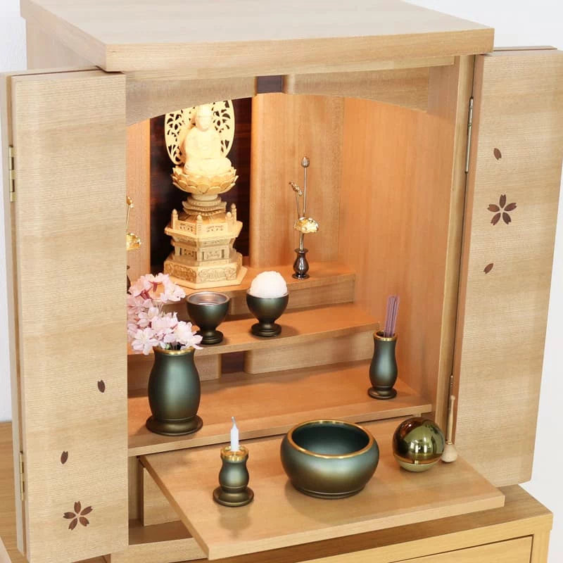 • 特 徴: 国産品 、 LEDライト 、 仏具板 、 引き出し収納 、 柾目の直線が多めの木目 、 セット仏壇の仏具シュミレーションあり 、 台の上に設置するタイプ