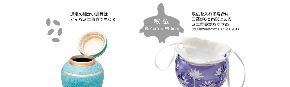 お客様の中には、形状が仏様が座禅をしている姿に見えるといわれている「喉仏(のど仏)」(別名:舎利)を入れ、手元供養される方もいらっしゃいます。喉仏は亡くなられた方の体格によりますが、一般的な成人の方のサイズで高さ4cm×幅6cm程度です。なので喉仏を入れる場合は口径の大きいミニ骨壺を選ぶと良いでしょう。