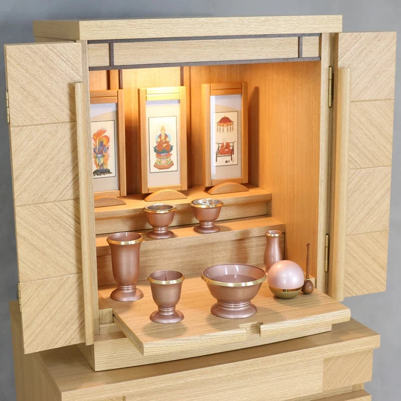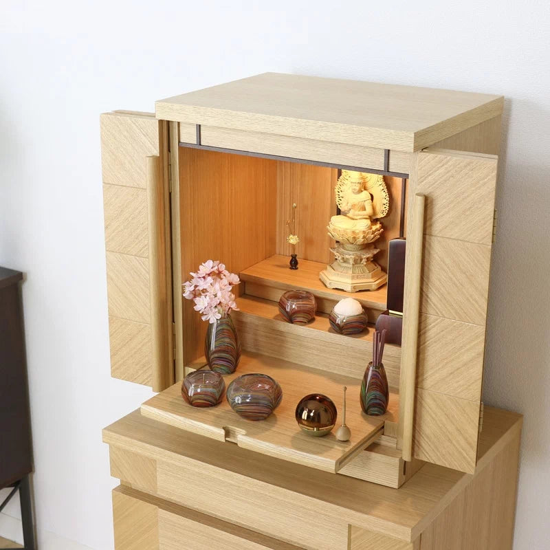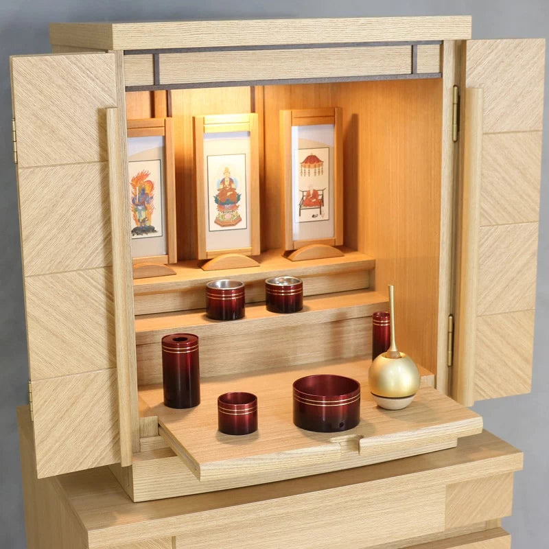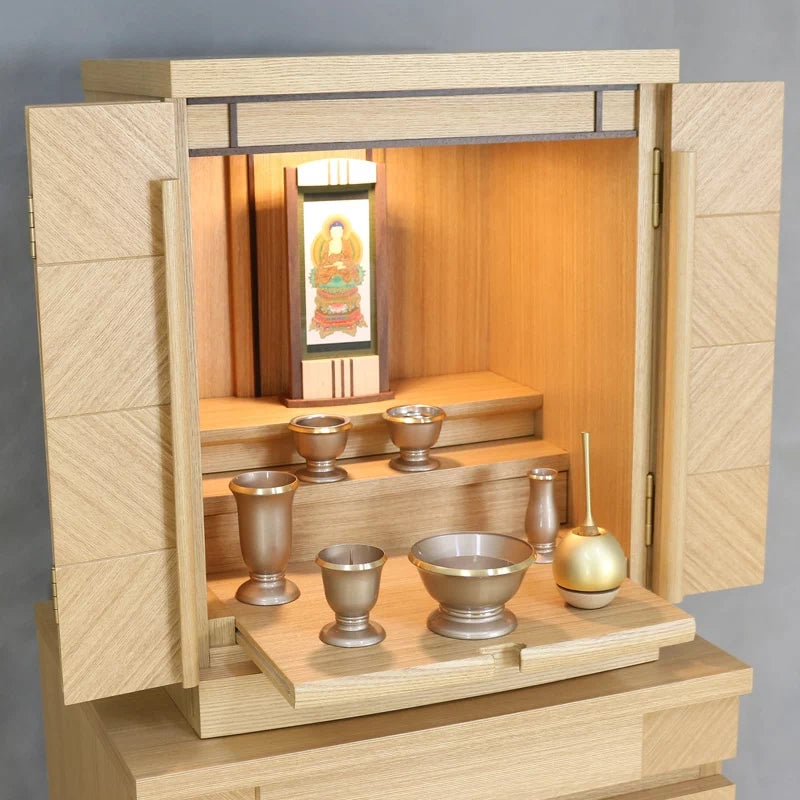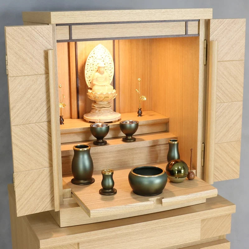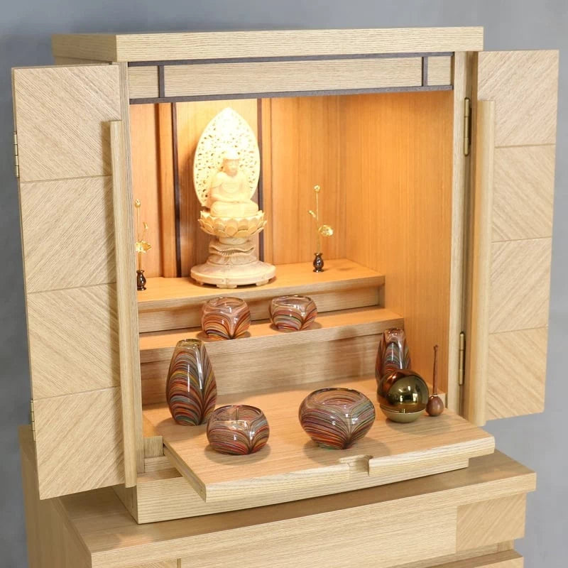 • 特 徴: 国産品 、 LEDライト 、 スライド式内部段 、 引き出し収納 、 須弥壇取り外し可能 、 柾目の直線が多めの木目 、 セット仏壇の仏具シュミレーションあり 、 台の上に設置するタイプ