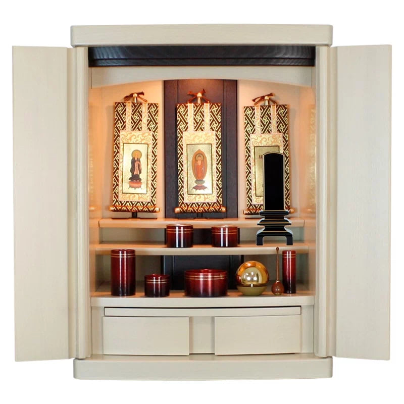 • 【店長おすすめセット01】「モダン仏壇 「アストロン」 18号 ミルキー色」とお位牌3.5寸のコーディネート例です。本尊には吊り下げ型掛け軸の20代 掛軸立て付き三尊をセットしました。仏具にはモダン仏具「ボルドー」グラデーションワイン色をセットしました。リンにはたまゆらリンのゴールド 1.8寸をセットしました。