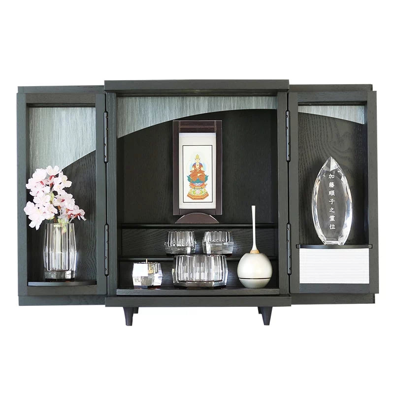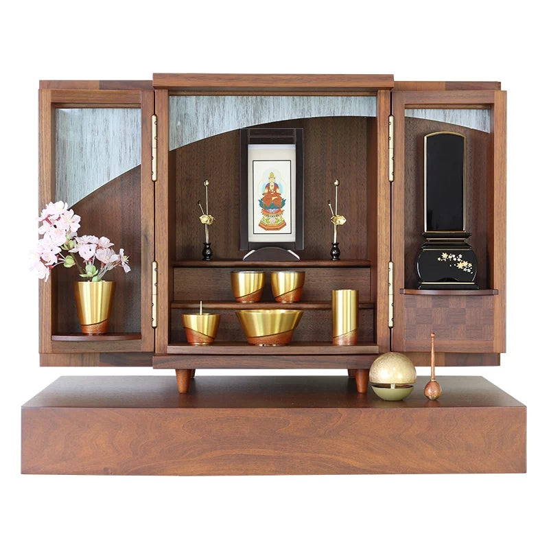 木材は強さとしなやかさを兼ね備えてた「タモ材」という木材を使用して作られております。元々明るい色合いの木材ですがウォールナット色に着色し、濃い色合いに仕上げております。濃いお仏壇はもちろんマッチしますし、明るいお仏壇に飾るとアクセントとして際立ちます。