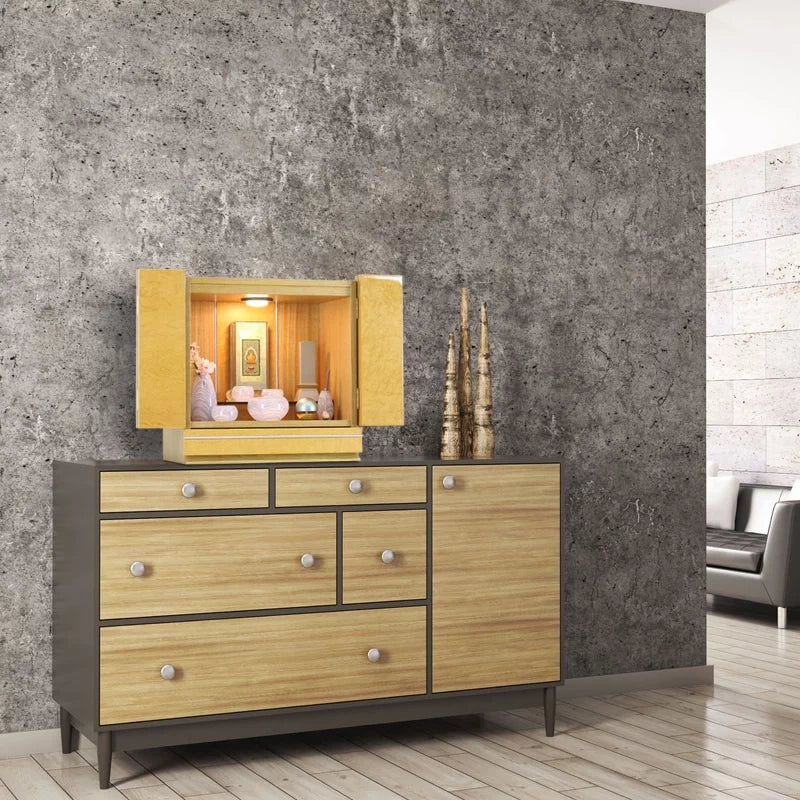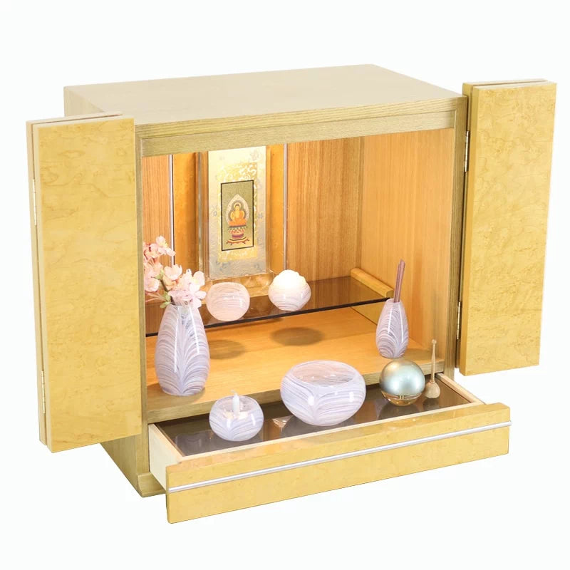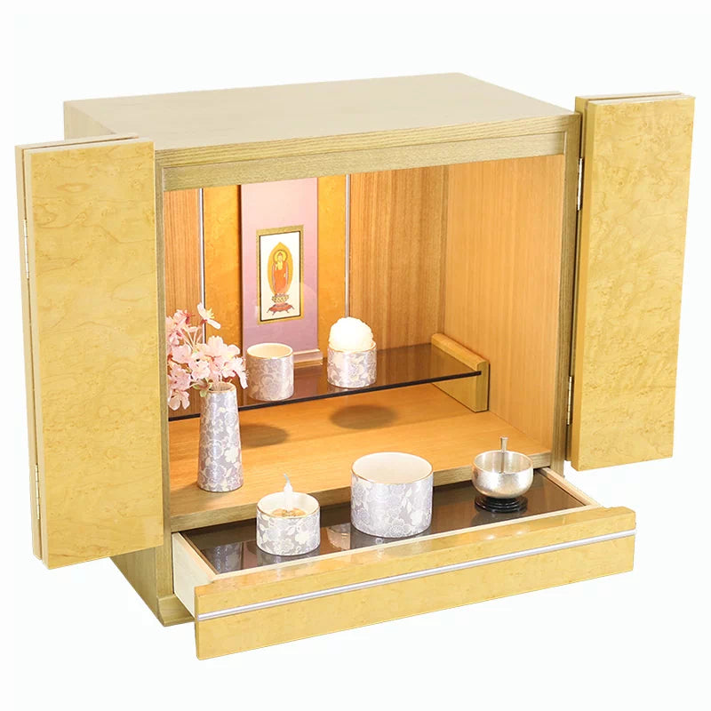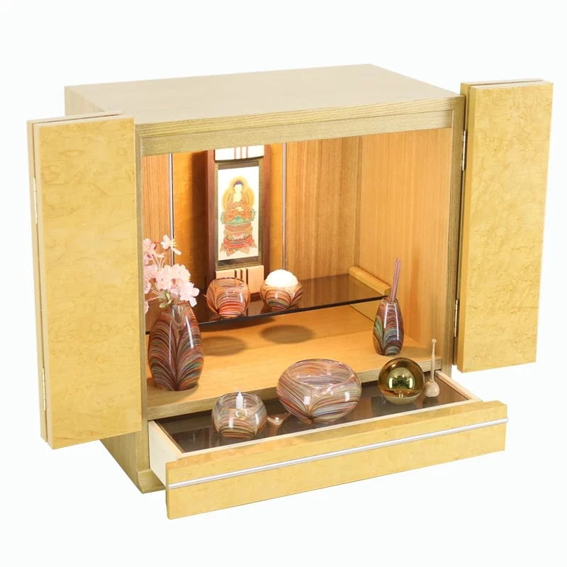 バーズアイメープルとタモを使用した木目の美しい上置きタイプの仏壇。