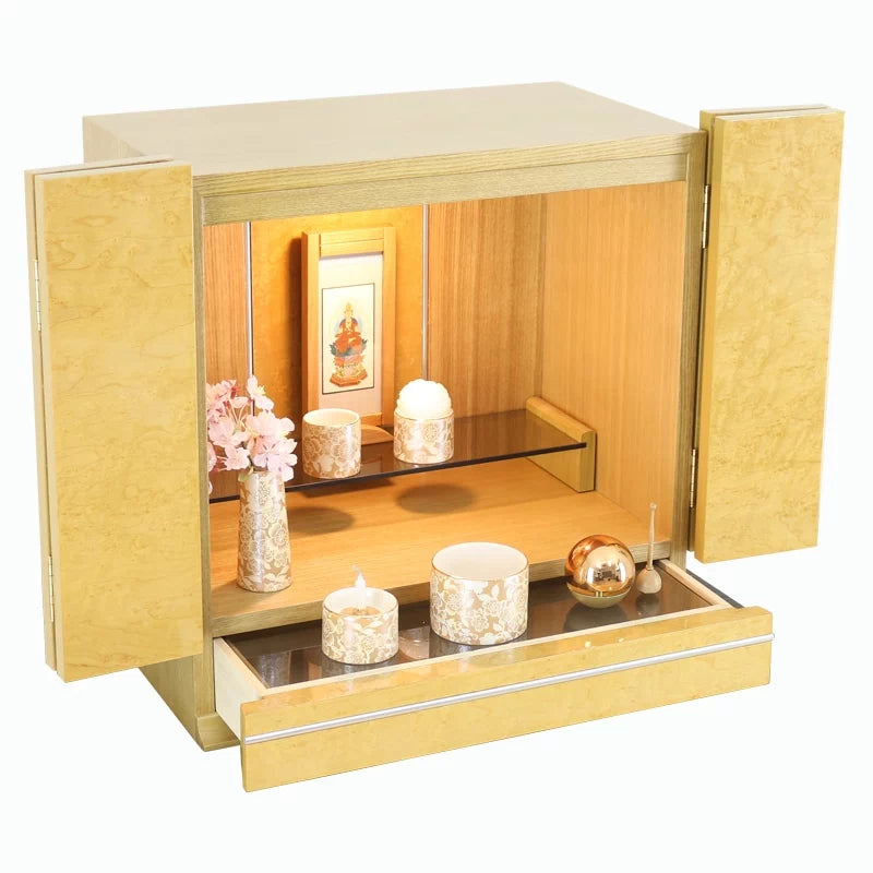 • 素 材: 【表面材】バーズアイメープル・タモ 薄板貼り 、 【戸板】バーズアイメープル薄板貼り 、 【台輪(底面)】タモ薄板貼り 、 【須弥壇】ガラス