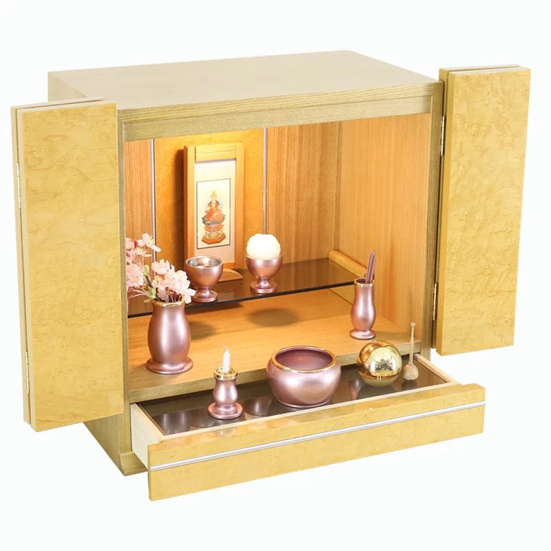 • 特 徴: 国産品 、 LEDライト 、 仏具板 、 鏡面仕上げ 、 須弥壇取り外し可能 、 セット仏壇の仏具シュミレーションあり 、 台の上に設置するタイプ 、 引き出し収納