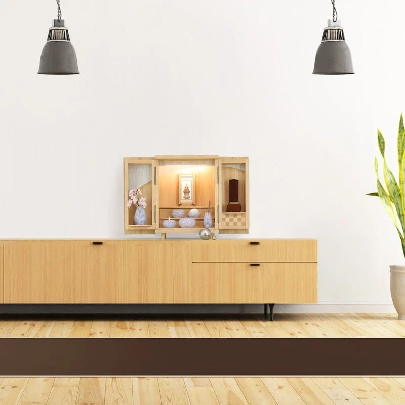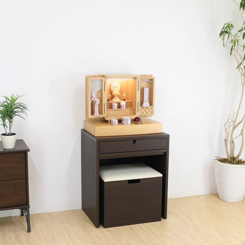 • お仏壇の色と設置する棚の色を合わせた組合せです。やわらかい色合いの木材のため、圧迫感なくインテリアに馴染みます。