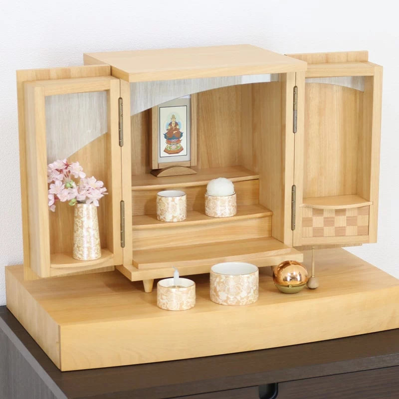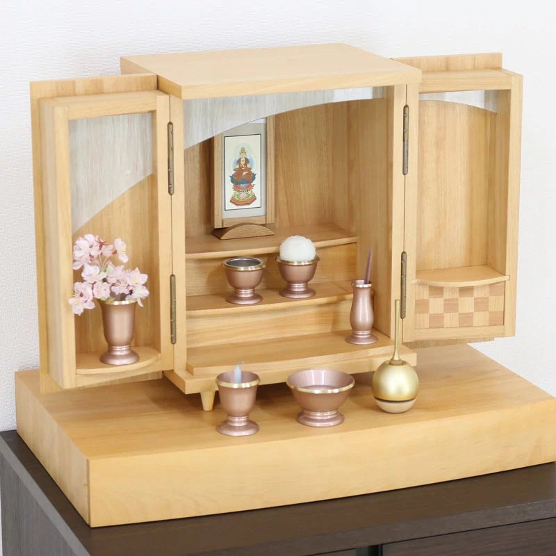 本尊には木製のスタンド掛軸をセットしました。木のナチュラルな質感と表面にはガラス板が加工されております。仏具はマカロンのサクラ色をセット。控え目なピンクの色合いはお仏壇に色どりを添えます。リンはチェリンウッドのゴールドをセットしました。りん棒が一体となっておりますので省スペースでお飾りして頂けます。