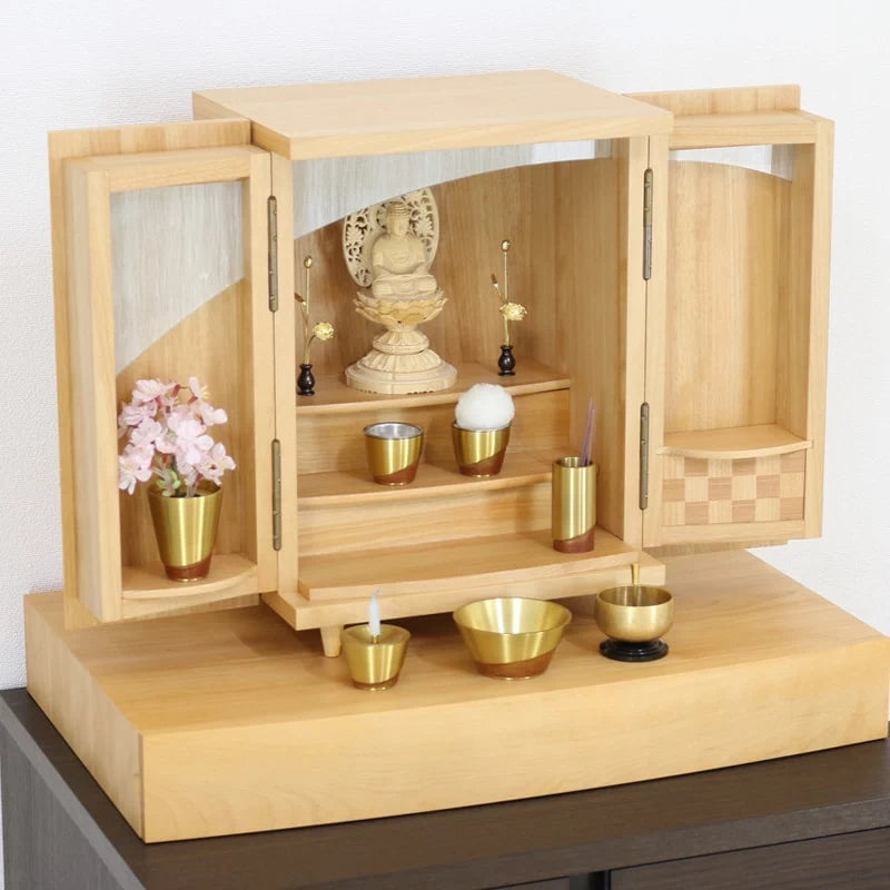 本尊には桧木仏像 丸台座 をセットしました。仏像の両脇のミニ常花は仏像を蓮花で引き立てるための仏具です。仏具は着物の衿をイメージしてデザインされた仏具です。置き方で360°違う表情になります。リンは煌リンの金結晶を組み合わせました。低い音色で余韻が長く響き渡ります。