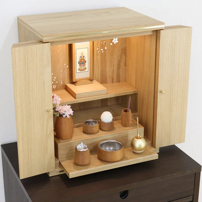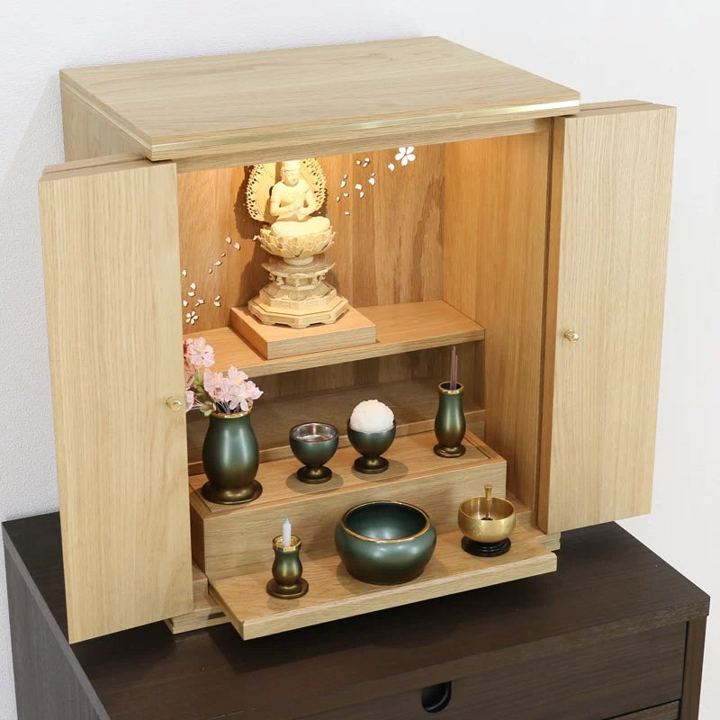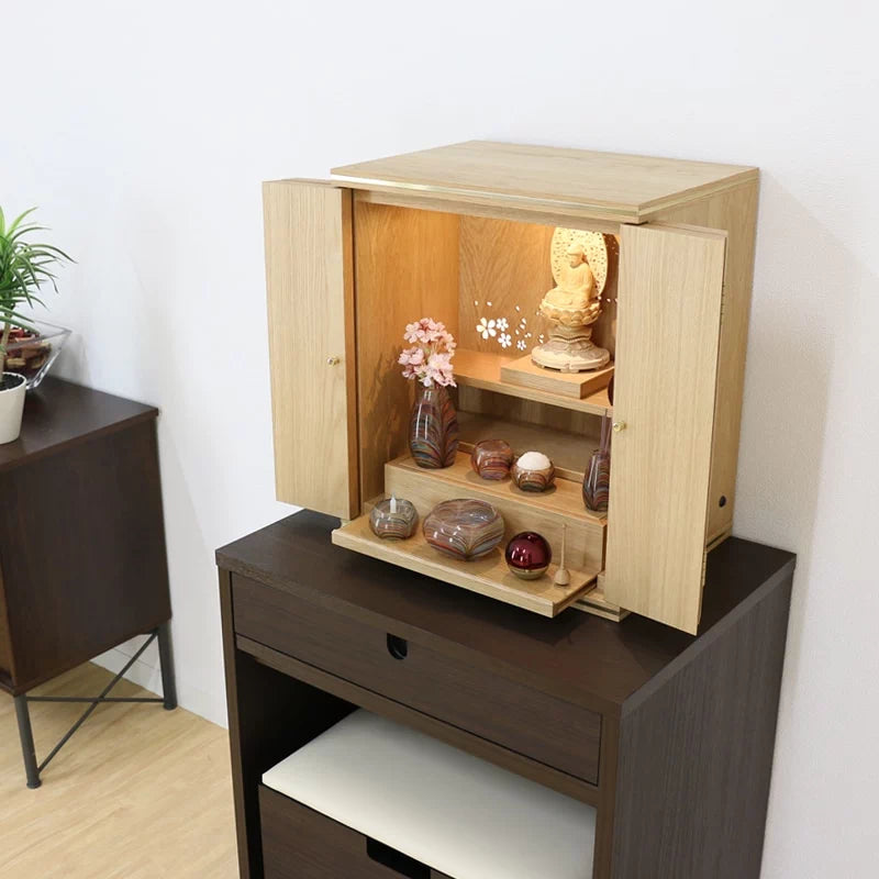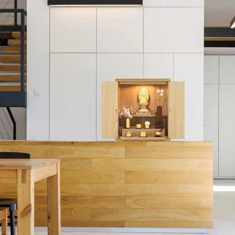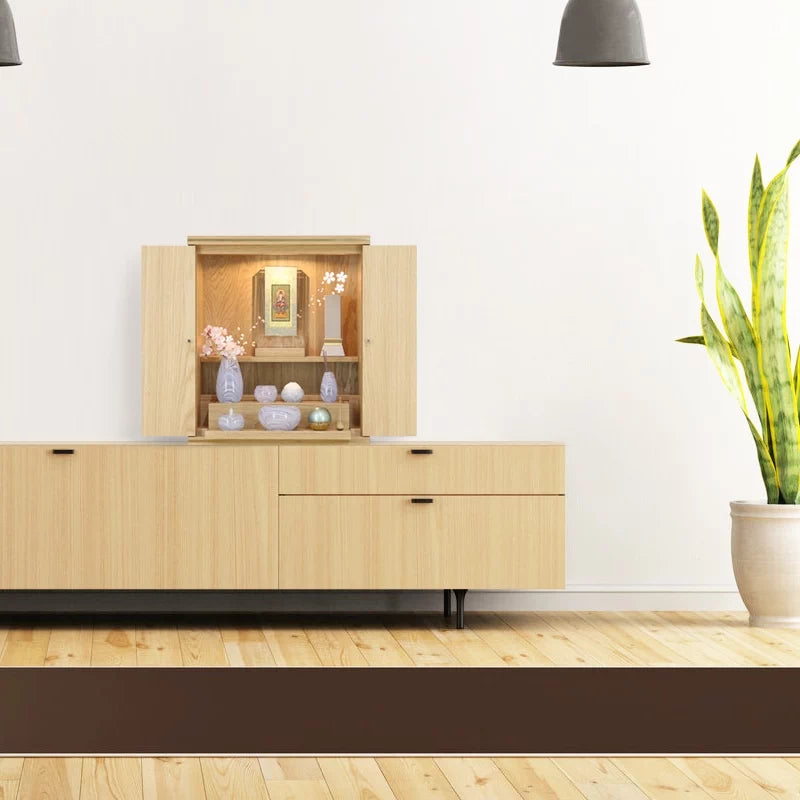 本尊やお位牌、仏具を並べる須弥壇を、自由にカスタマイズしていただけます。また、小物入れになるスライド式の内部段も内蔵されており、普段使いの小物や形見などを収納でき、上には仏具をゆったりとお並べいただけます。扉を閉めれば、外からはお仏壇と判らないようなモダンなインテリアのようなデザインです。
